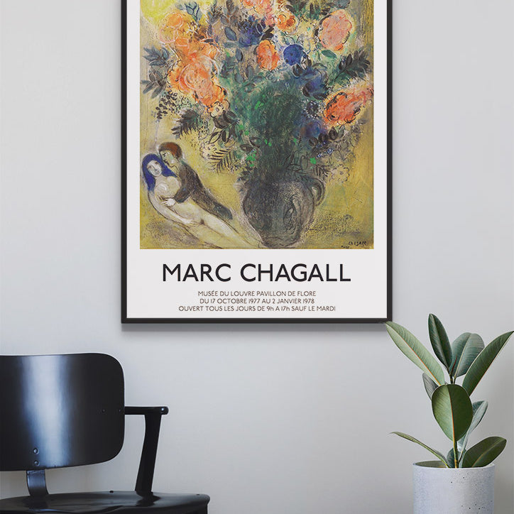 Marc Chagall created Fleurs et Couple in 1948 in Surrealism style. This is a reproduction of a vintage French exhibition poster. The print comes without the frame.