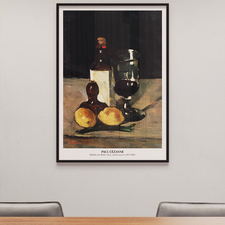 Paul Cézanne poster featuring his artwork Still Life with Bottle, Glass, and Lemon. Cézanne is one of the great Post-Impressionist painters of the 19th century, renowned for his landscapes, portraits, and complex still lifes.