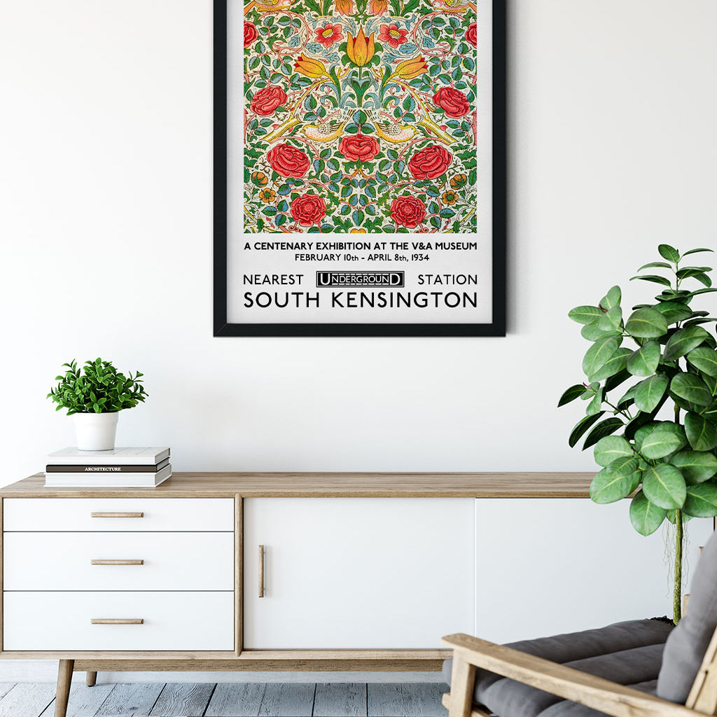 Vintage rose floral art print. A beautiful exhibition poster by William Morris, a classic flower pattern in Arts and Crafts style that will give your home a timeless style. Red, yellow and green coloured floral illustration with the name of the artist on the top and the exhibition details at the bottom.