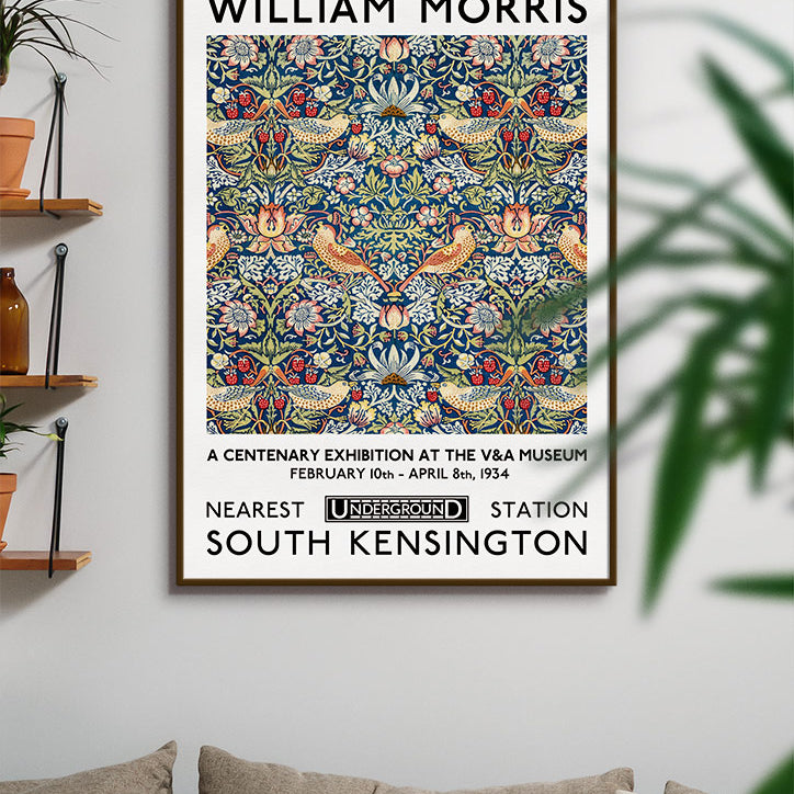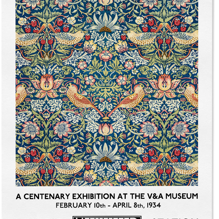 Vintage exhibition poster by William Morris. This classic Strawberry Thief pattern by will give your home a timeless style. Vintage bird illustration with the name of the artist at the top and the exhibition details at the bottom.