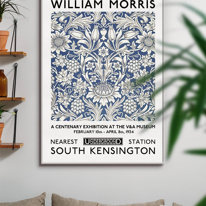 Exhibition poster with Sunflower illustration by William Morris. This Arts and Crafts inspired print is a great choice of art to decorate your walls.