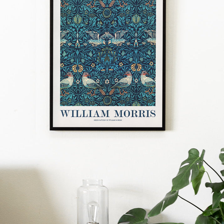 Classic blue bird pattern by William Morris with blue text at the bottom. Reproduction of a beautiful exhibition poster for the centenary exhibition in the Victoria and Albert Museum.