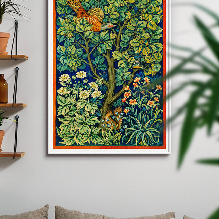A beautiful illustration by William Morris with green leaves, flowers and a bird. This William Morris inspired art print can be a perfect decoration for your home.