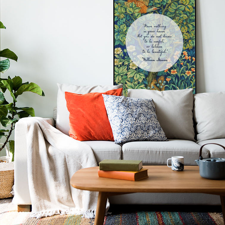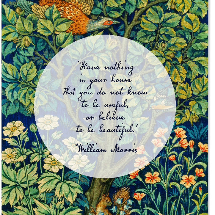 “Have nothing in your house that you do not know to be useful, or believe to be beautiful.” A lovely print with one of the most famous William Morris quotes with the famous Cock Pheasant motif in the background.