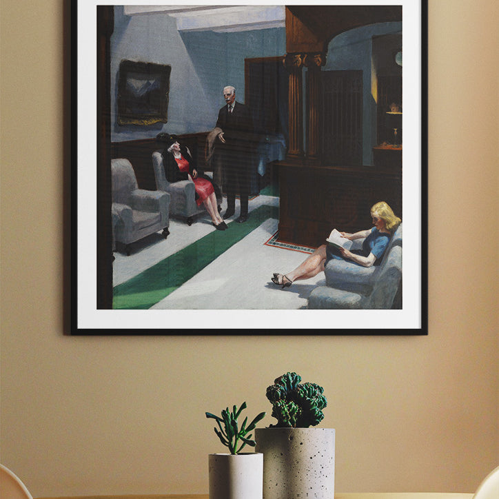 Experience the timeless beauty and intrigue of Edward Hopper's masterpiece, the Hotel Lobby. This square art print captures every detail and invites you to step into the scene. Perfect for adding a touch of classic elegance to any room.