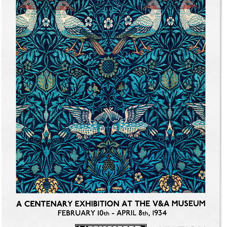 A beautiful exhibition poster by William Morris with the artist's name on the top. Vintage bird illustration. This classic pattern will give your home a timeless style.