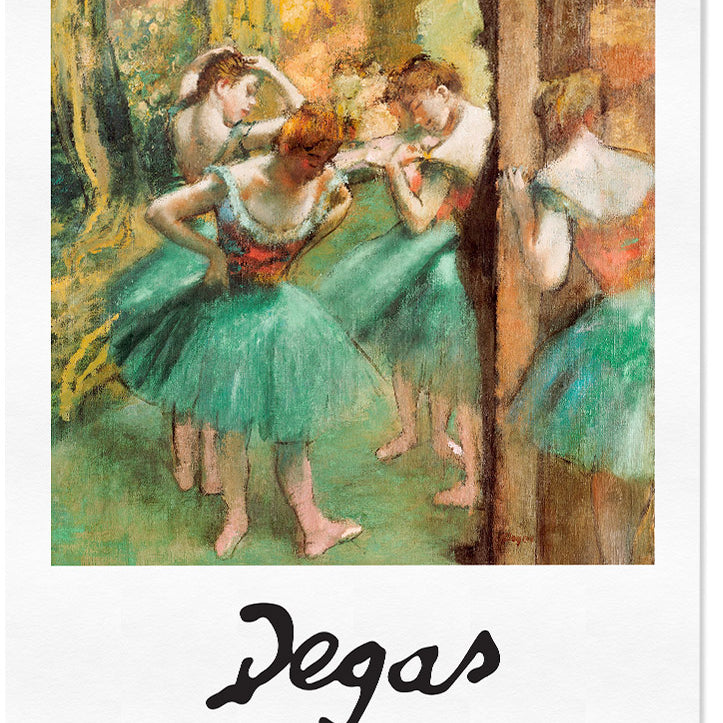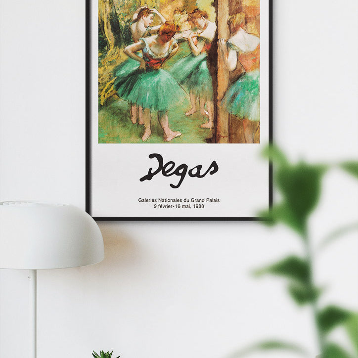 Edgar Degas (1834-1917) exhibition poster featuring his painting Dancers, Pink and Green from ca. 1890. Degas was a French Impressionist artist famous for his pastel drawings and oil paintings but he also produced bronze sculptures, prints and drawings. He is especially identified with the subject of dance as more than half of his works depict dancers.