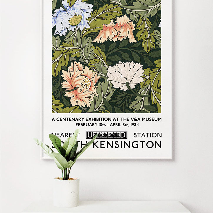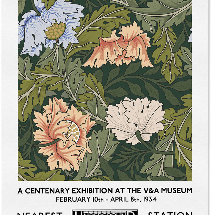 Classic flower pattern by William Morris. With the artist name on the top and exhibition details at the bottom this exhibition poster will give your home a timeless style.