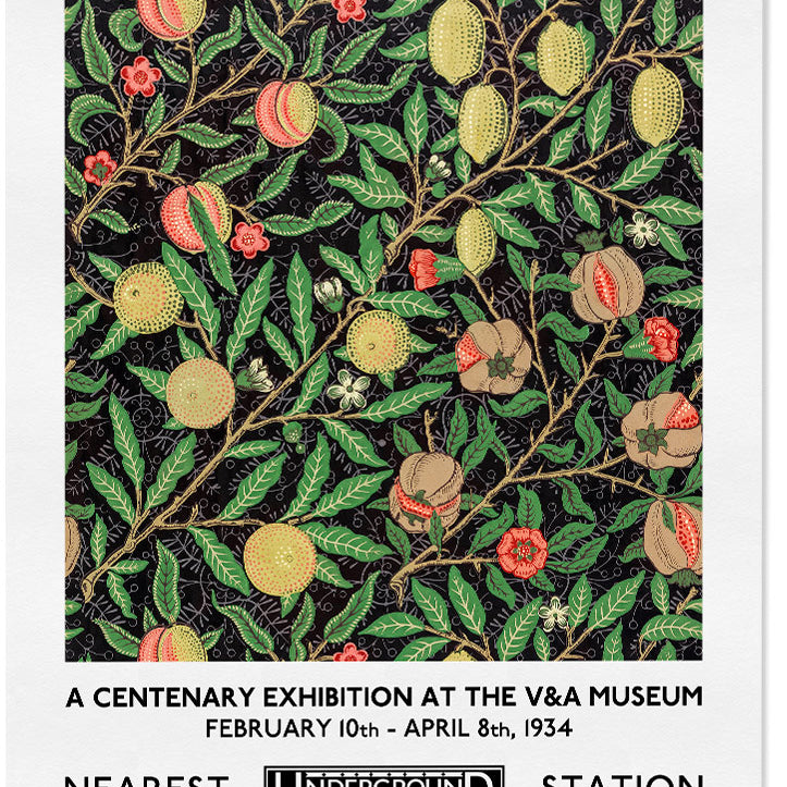William Morris exhibition poster featuring his colourful citrus fruit illustration.
