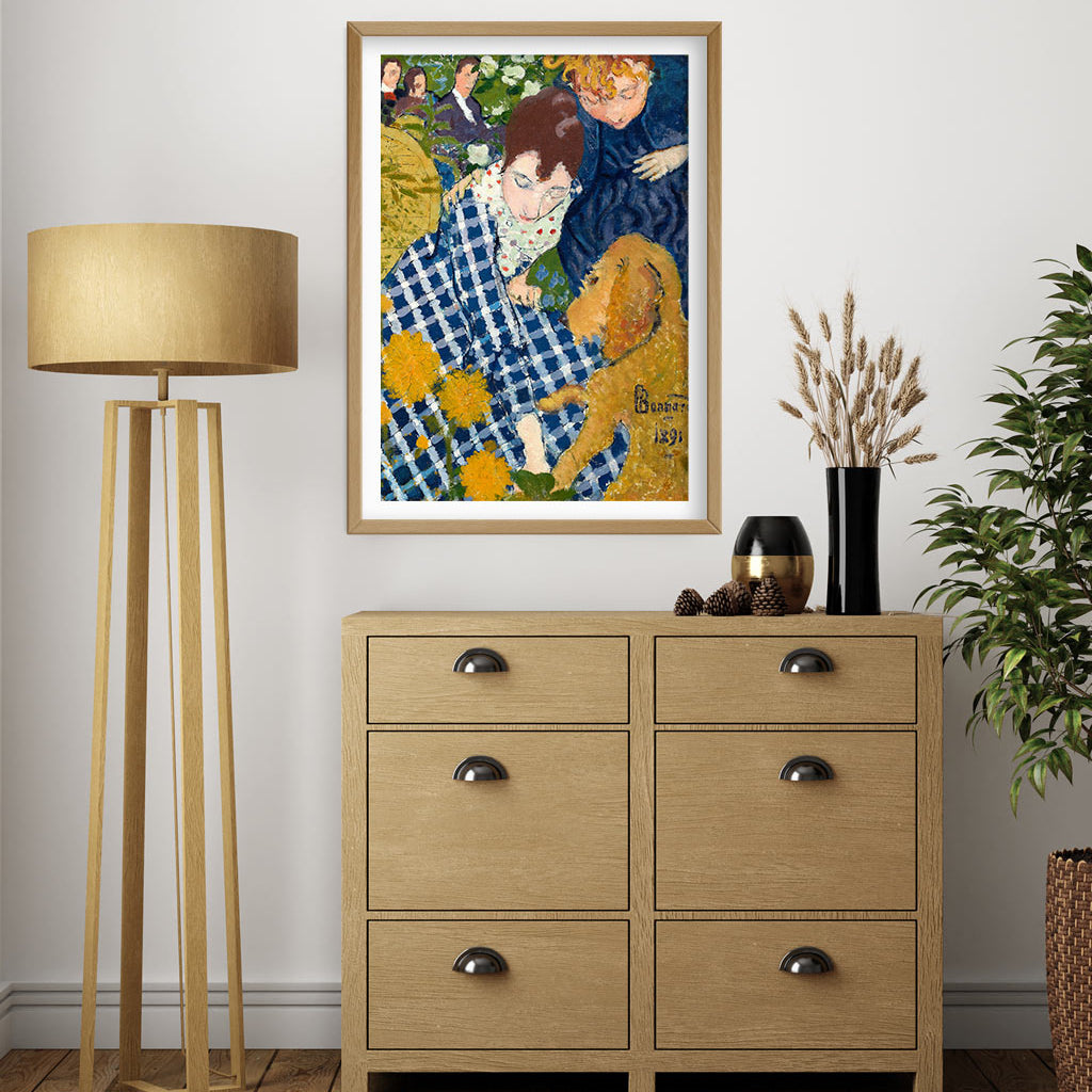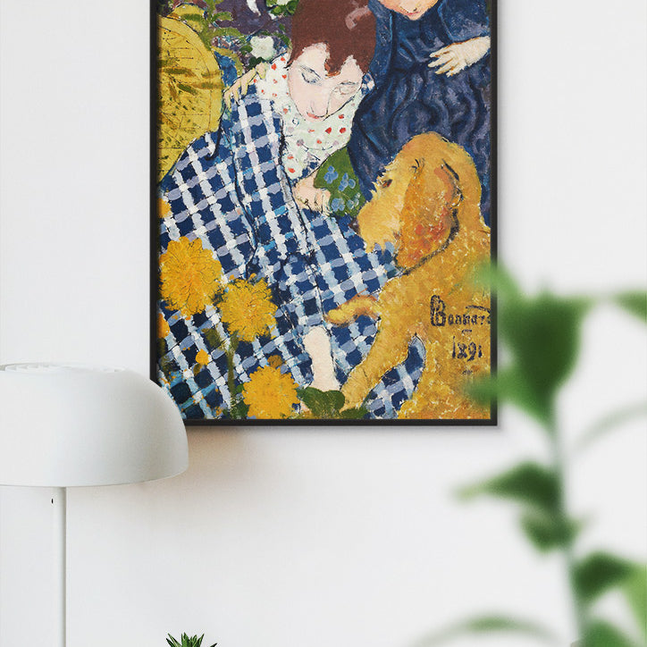 Art exhibition poster by Pierre Bonnard featuring his painting the "Woman with Dog". Pierre Bonnard was a French painter, illustrator and printmaker, known especially for the stylized decorative qualities of his paintings and his bold use of color.