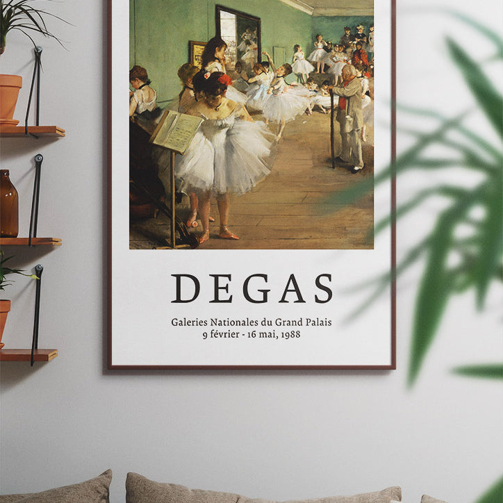 Edgar Degas (1834-1917) exhibition poster featuring his painting The Dance Class from 1874. Degas was a French Impressionist artist famous for his pastel drawings and oil paintings but he also produced bronze sculptures, prints and drawings.