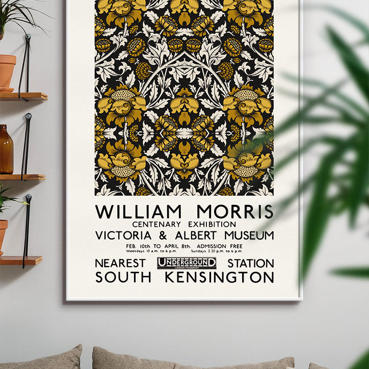This William Morris centenary exhibition poster is a must-have for any lover of the Arts and Crafts Movement. The intricate details and captivating colours of the gold floral motif, set against a black background, are truly breathtaking.