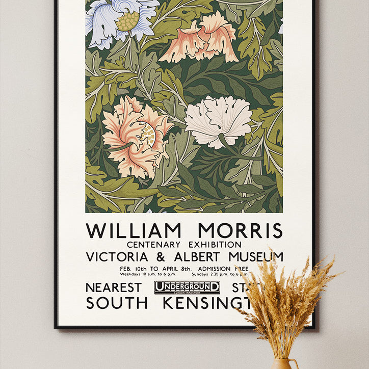 A beautiful green floral exhibition poster by William Morris. William Morris (1834–1896) was a British textile designer, poet, novelist and socialist activist associated with the Arts and Crafts Movement.