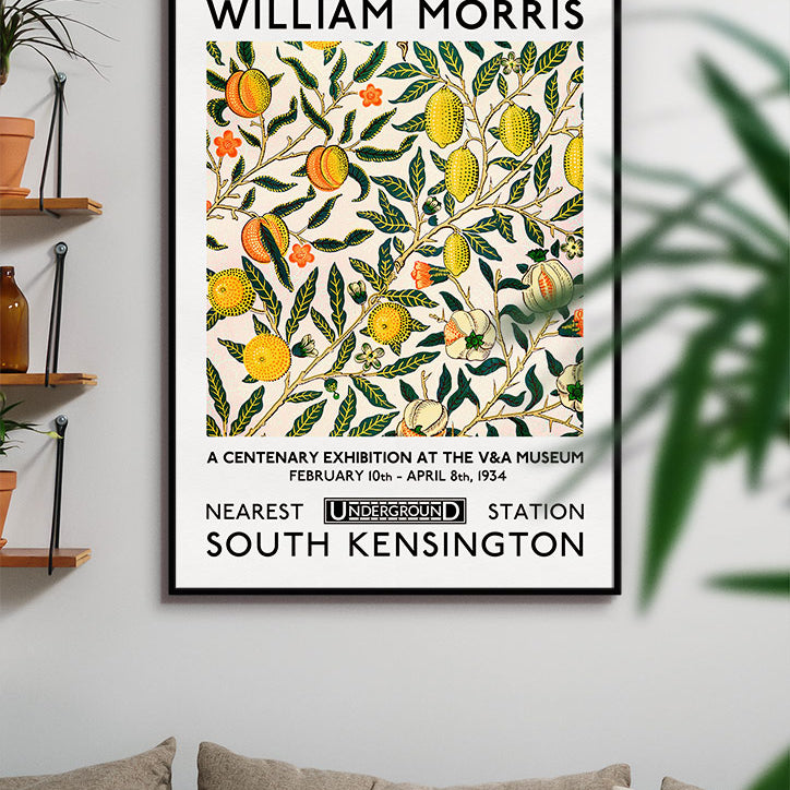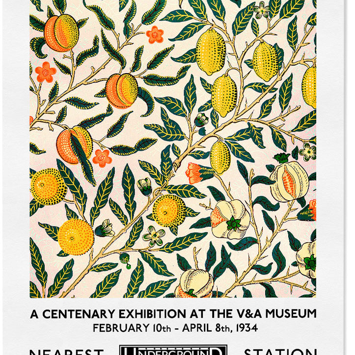 Reproduction of a vintage William Morris exhibition poster held in 1934 in the Victoria and Albert Museum. This eye-catching art print with its vintage citrus fruit illustration from William Morris is an ideal way to add a hint of class and elegance to any space.